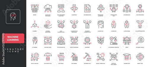 Machine learning, automatic data classification and mining, AI assistant line icon set. Artificial intelligence model, document processing, server thin black and red symbols vector illustration