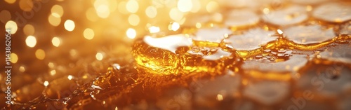 Macro capture of glistening honey draping over intricate honeycomb structure in natural light