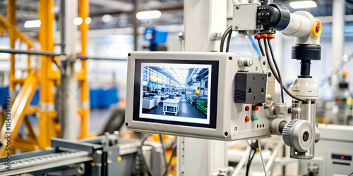 Macro Close Up AI Powered Monitoring Device Factory Advanced Technology Real Time Production Monitoring Copy Space Photograph Stock Concept