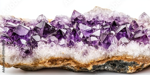 Macro close up of an amethyst crystal druse showcasing its intricate textures and vivid colors against a white background, highlighting the beauty of the amethyst crystal druse in detail.