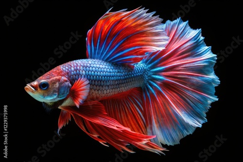 Macro close-up: Betta splendens, vibrant against a black backdrop, showcasing underwater artistry.