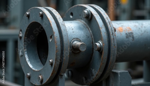 Macro close-up of a steel cooling pipe joint with bolts and welded seams, sharp metallic detail, side view, blurred background, ideal for engineering, plumbing, and industrial themes