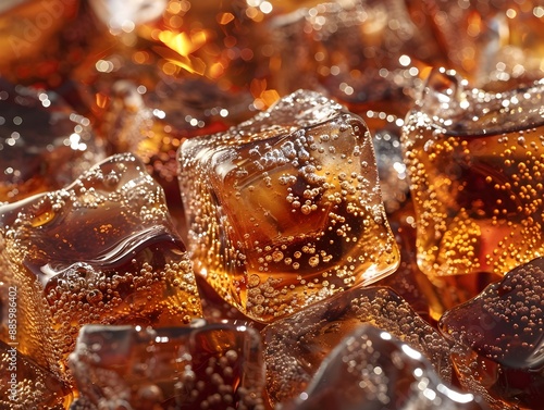 Macro Closeup of Chilled Cola Beverage with Glistening Ice Cubes and Bubbles