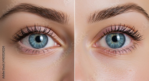 Macro Comparison of Woman's Rejuvenated Blue Eyes with Detailed Skin Texture Indoors in Soft Lighting