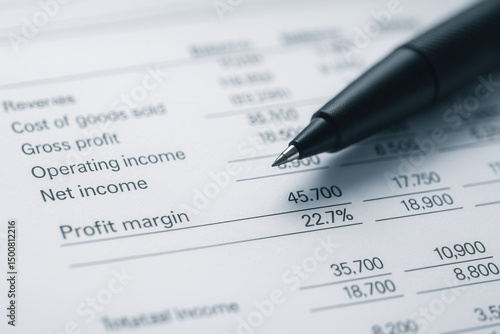 Macro Detail of Financial Report Balance Sheet with Fine-Tip Pen Resting on Profit Margin Highlight