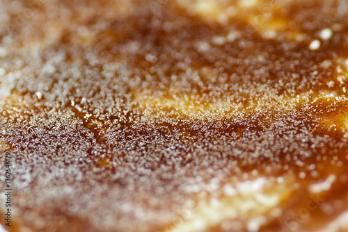 Macro image of golden brown caramelized sugar topping on a classic creme brulee dessert