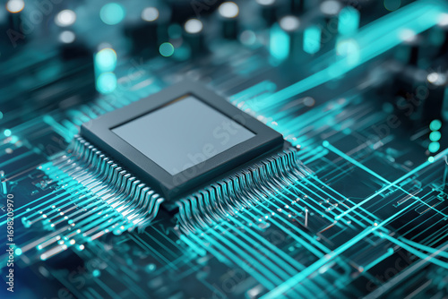 Macro microchip on motherboard with translucent network overlay, cool cyan-blue accent lighting, business infographic style background