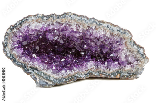 Macro Mineral Stone Amethysts in the rock on a white background
