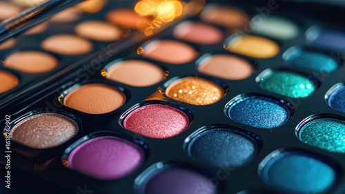 Macro of a vibrant eyeshadow palette with a brush gently picking up a sparkling color, rich tones, glamorous.