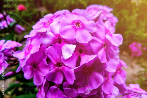 Macro photo nature lilac wild Phlox subulata flower. Texture background blooming Phlox subulata wildflower. The image of a plant blooming lilac purple Phlox subulata.