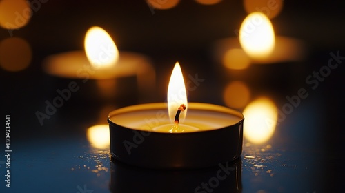 Macro Photography of Burning Candles with Warm Glow, Bokeh Lights, Dark Background, Intimate Atmosphere, Tealight Candles, Shallow Depth of Field, Soft Focus, Romantic Ambiance, Golden Light,