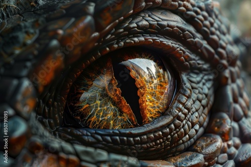 Macro photography of the intense. Vibrant eye of a reptile with scaly skin. Capturing the intricate detail and texture of its orange and black pattern. Wildlife nature photograph