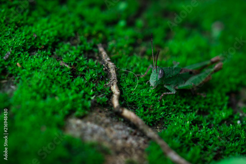 Macro shot detail of small grasshopper on green grass. Insect ecology. Small animal in the world. Grasshopper's life cycle