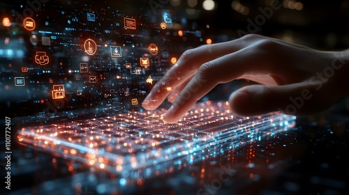 Macro Shot Hand Typing Transparent Holographic Keyboard Digital Marketing Icons