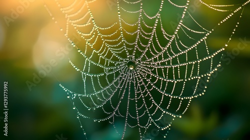 Macro shot of a dew-covered spider web highlights realistic strands and dew drops in soft golden morning light against a green background, offering an intricate close-up view of nature’s detail.