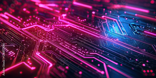Macro shot of a futuristic circuit highlighted by neon lines and pulsating light, perfect for sci-fi and high-tech designs.