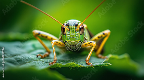 Macro shot of a grasshopper facing the camera, highlighting its vibrant colors and textures.