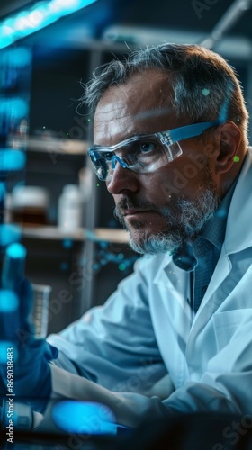 Macro shot of a scientist analyzing data on a computer screen in a modern laboratory setting