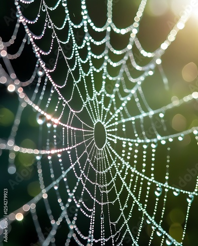 Macro shot of a spider web with dewdrops sparkling in the sunlight, highlighting the intricate details of its silk threads and the beauty of natural symmetry in the wild.