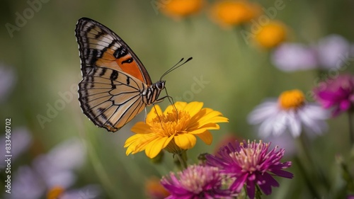 Macro shot of A vibrant butterfly perched on a colorful flower. The wings of the butterfly should be open, displaying their full pattern and color. A blooming meadow with a variety of wildflowers. The