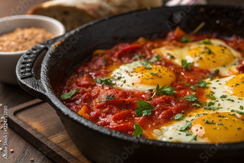 Macro Shot of Delicious Shakshuka: Spicy Tomato & Pepper Sauce with Perfectly Poached Eggs in a Cast Iron Pan