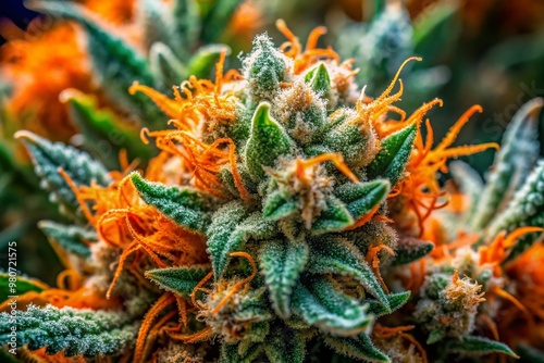 Macro shot of dried cannabis buds with vibrant green and orange hues, trichomes glistening, showcasing the medicinal herb's intricate details and potent beauty.