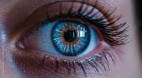 Macro shot of female robotics engineer's eye reflecting circuit board glow, cyberpunk lighting, extreme detail in eyelashes and iris patterns, cinematic realism