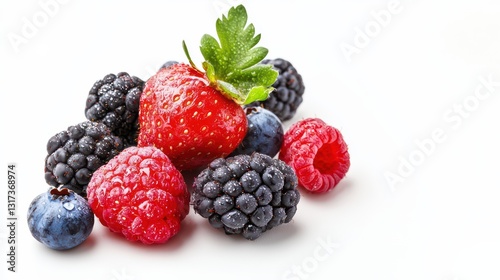 Macro Shot of Fresh Berries with Dew Drops on a Clean White Background