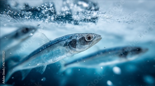 Macro shot of icefish swimming near translucent ice shelf, surreal blue tones, floating particles in water