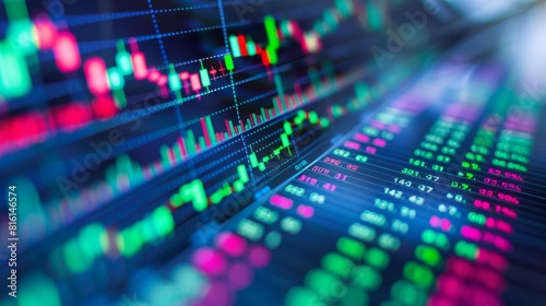Macro shot of vibrant financial charts on a monitor, displaying fluctuating stocks and commodities, focus on glowing green and red bars