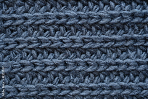macro texture of woolen dark gray crocheted sweater as background, close-up of gray crocheted front surface, woolen texture of woolen wool, knitted front surface