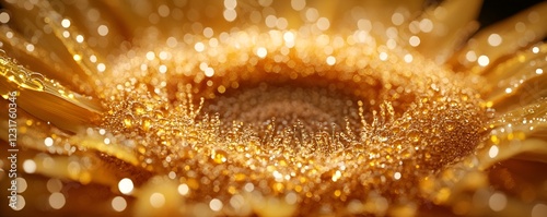 Macro view of a golden sunflower center with sparkling dew droplets capturing intricate details.