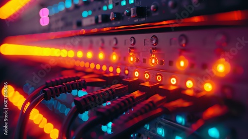 Macro view of switch in rack, glowing status LEDs, sharp detail, ethernet cable connectivity