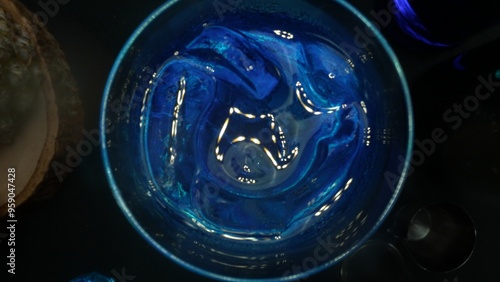 Macrography with a top-down view of a professional bartender hand elegantly serving a Blue Hawaii cocktail with black background. Close-up shot captures the fluid motion. Aerial view. Comestible.