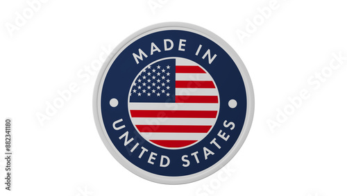 Made in United States, USA . Circle country flag product label round pinback button banner simple. Transparent backgound. 3d rendered with alpha channel. Round shape.