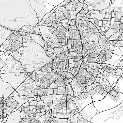 Madrid Area Map with Labels and Neighborhoods - One color, minimalistic design