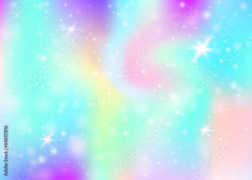 Magic background with rainbow mesh. Girlie universe banner in princess colors. Fantasy gradient backdrop with hologram. Holographic magic background with fairy sparkles, stars and blurs.