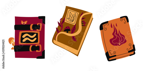 Magic book on astrology, magic tattoo for witch, book of spells and witchcraft. Hand drawn tattoo in bohemian design, vector illustration isolated on white background.