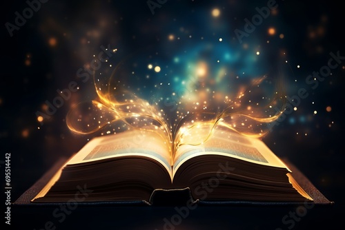 Magic Book With Open Pages And Abstract Lights Shining In Darkness - Literature And Fairytale Concept