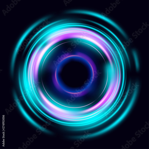 Magic circle light effects. Illustration isolated on dark background. Mystical portal. Bright sphere lens. Rotating lines. Glow ring. Magic neon ball. Vector.