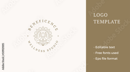 Magic human palms lotus relax meditation minimalist line art logo vector illustration