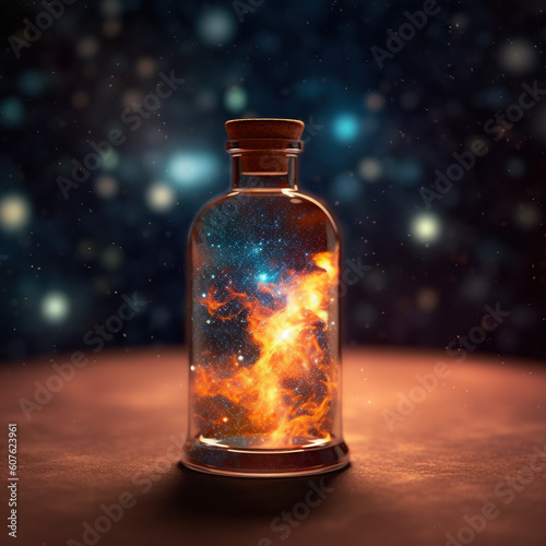 Magic in a Glass Bottle. Simulated Starry Sky. Unveiling the Unreal Universe, Galaxy of Stars, Glimpse of Milky Way, Astronomy Magic, Cosmic Fantasy in Space, Science. Generative AI