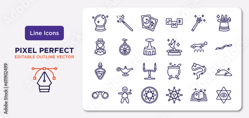 magic outline icons set. thin line icons such as crystal ball, magic, acrobatic, potion, smoke, astral, magic book, esoteric vector.