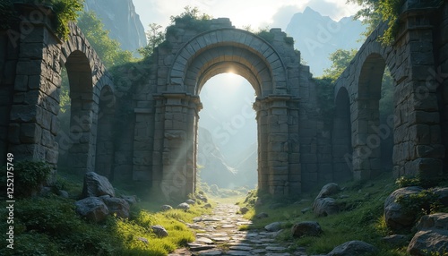 Magic stone gate with light through pillars. Old arch. Mysterious portal to another world. Mediaeval architecture, mythology. Fantasy landscape. Tunnel to paradise. Mystical gateway. Universe