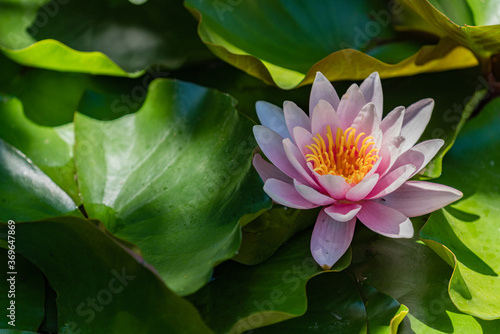Magic white water lily or lotus flower Marliacea Rosea in shady garden pond. Selective focus. Contrast closeup of Nymphaea with water drops on large leaves floating in water. Floral landscape.