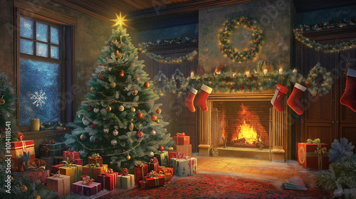 Magical Christmas Scene in Cozy Living Room, Decorated Tree with Ornaments, Twinkling Lights, Wrapped Presents, Glowing Fireplace, Snowflakes, Festive Ambiance, Warm and Joyful Spirit