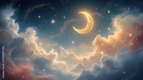 Magical Crescent Moon Floating Among Glowing Red and yellow Nebula Clouds – Enchanting Night Sky Fantasy Digital Art