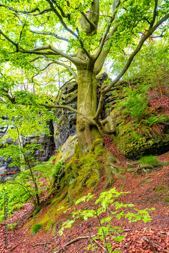 Magical enchanted fairytale forest, sandstone rocks named Kleinhennersdorfer Stein and ancient beech trees at the hiking trail in the national park Saxon Switzerland, Bad Schandau, Germany.