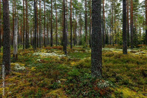 Magical fairytale forest. Forest covered of green moss in autumn