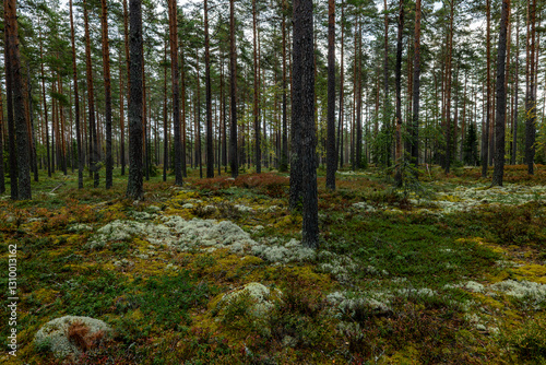 Magical fairytale forest. Forest covered of green moss in autumn
